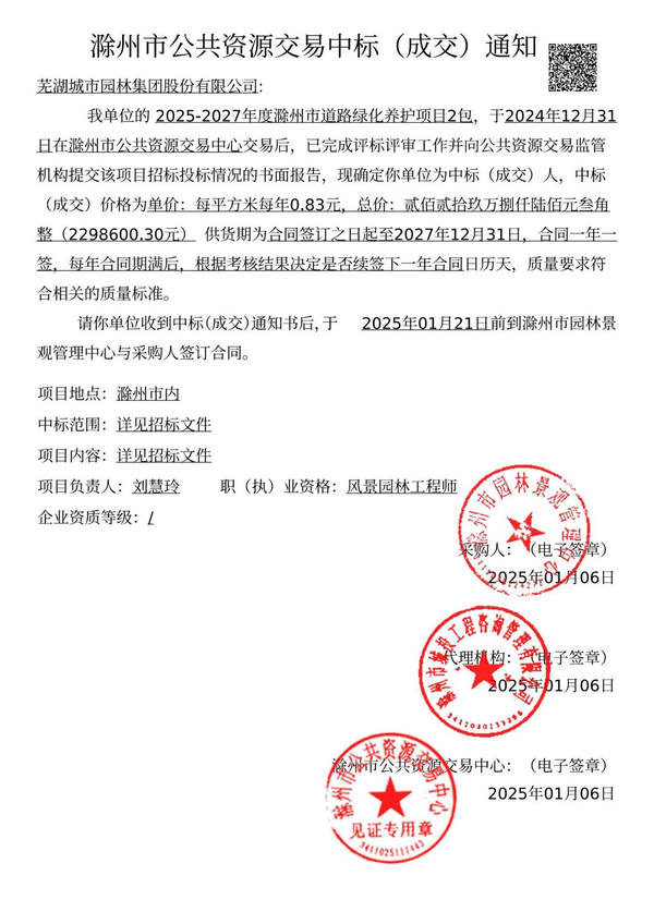 •       歲序更替,華章又新,園林集團(tuán)中標(biāo)喜訊傳來(lái),成功斬獲2025-2027年度滁州市道路綠化養(yǎng)護(hù)項(xiàng)目2包,實(shí)現(xiàn)開門紅,獻(xiàn)上新春賀禮。此次中標(biāo),是園林集團(tuán)在滁州市綠化市場(chǎng)的首次亮相,也是公司在蕪湖市外業(yè)務(wù)拓展的重大突破。