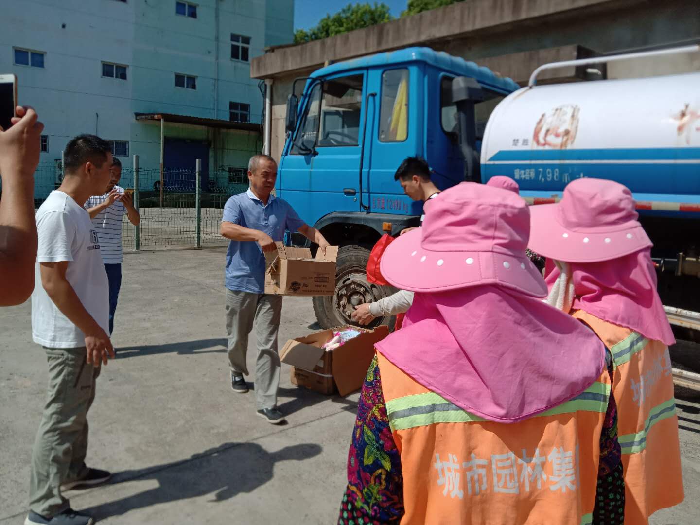 7月30日,集團(tuán)公司童朝陽董事長(zhǎng)、程怡副書記、李琦副總經(jīng)理、曹慧副總經(jīng)理、王軍副總經(jīng)理、紀(jì)委書記江守清同志帶領(lǐng)相關(guān)人員,準(zhǔn)備了肥皂、毛巾、人丹、風(fēng)油精等防暑降溫物品,慰問戰(zhàn)斗在綠化一線的工人們。