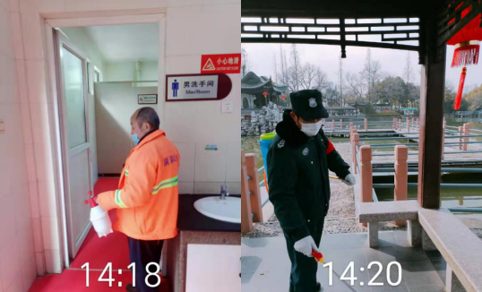2、藍綠公司組織工作人員每日對公司管理范圍內(nèi)鏡湖公園、九蓮塘公園等多處場地的公共設施、勞動工具、座椅、垃圾桶、公廁等進行消毒;同時通過廣播、喇叭、宣傳欄和顯示屏等方式充分宣傳防疫知識。