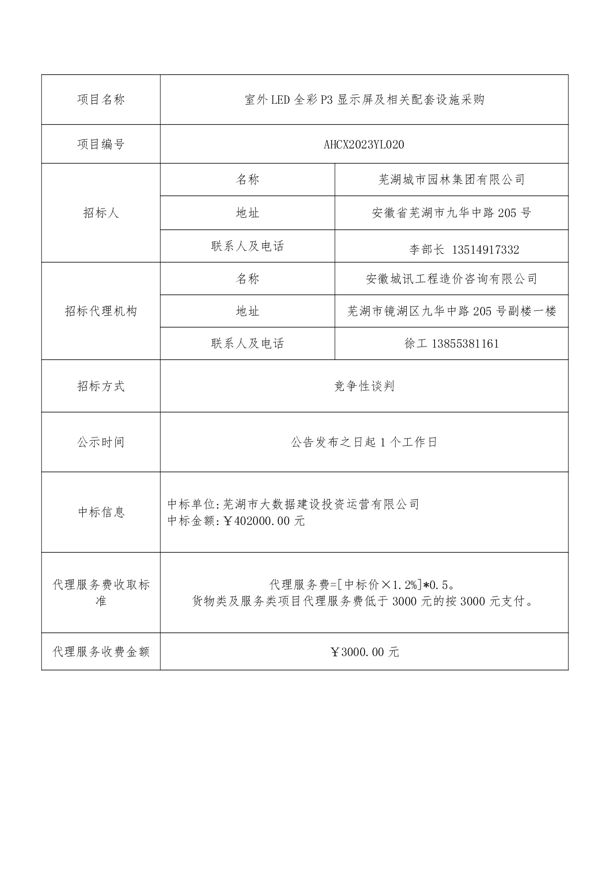 室外LED全彩P3顯示屏及相關(guān)配套設(shè)施采購中標結(jié)果公示