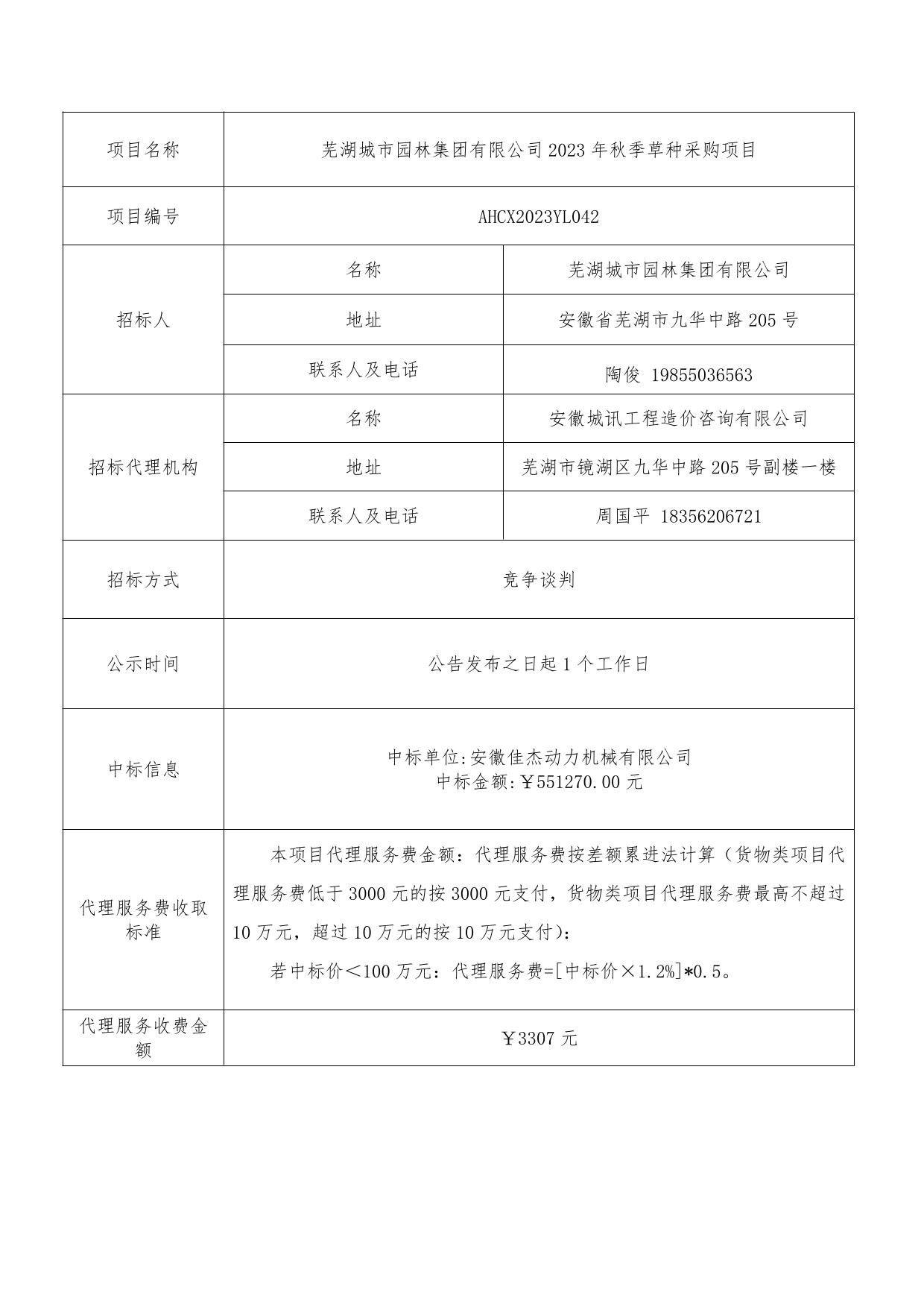 蕪湖城市園林集團有限公司2023年秋季草種采購項目中標結(jié)果公示