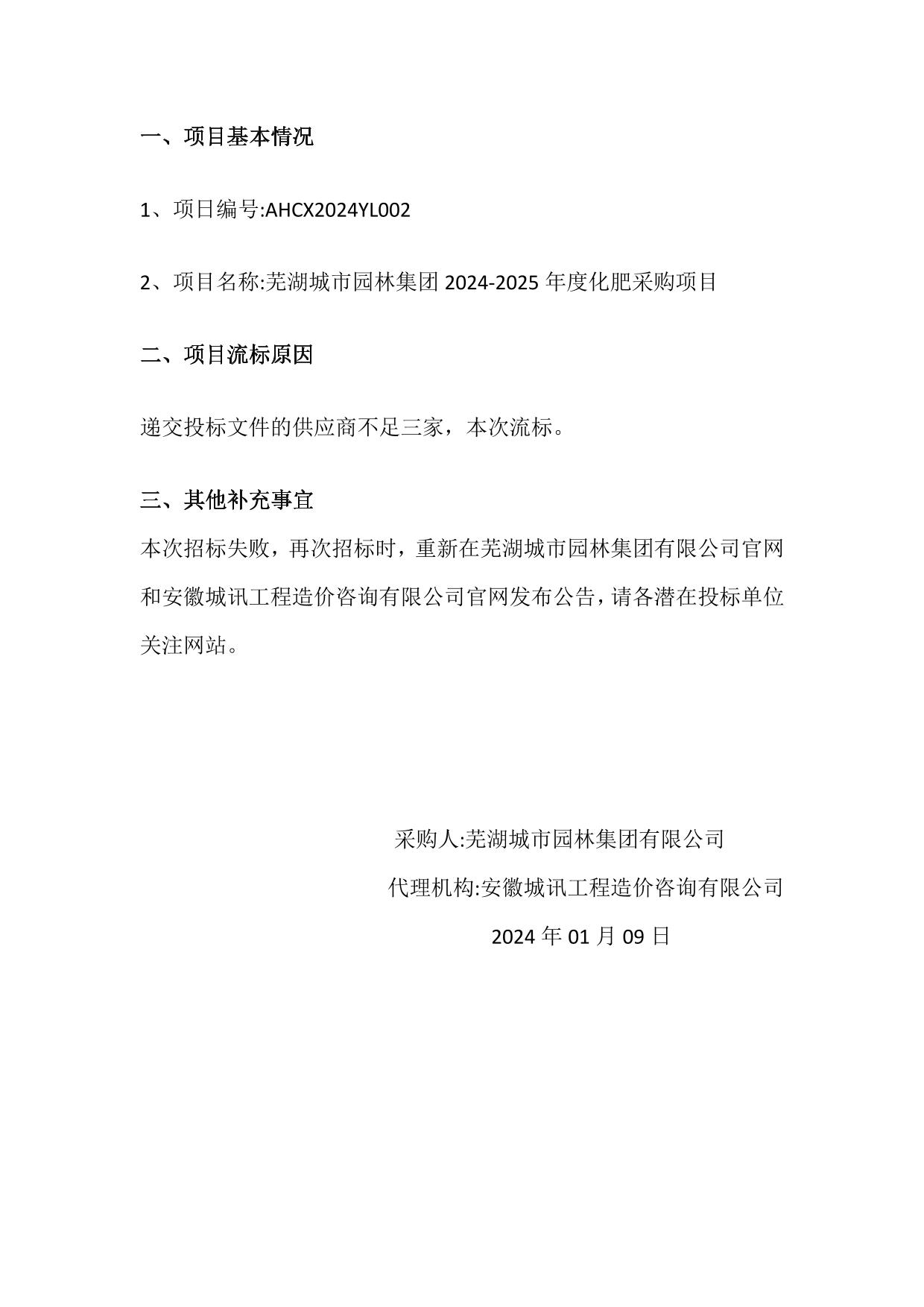 蕪湖城市園林集團(tuán)2024-2025年度化肥采購(gòu)項(xiàng)目流標(biāo)公告