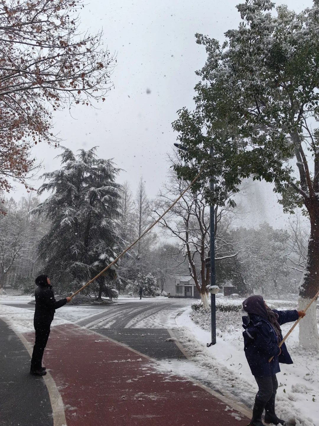 在白天清雪期間,神山廣大干部職工不畏嚴(yán)寒,不怕累,分工協(xié)作,有的用竹桿將樹上的積雪敲落,有的用鏟子將冰雪推到路邊,有的用掃帚將積雪掃進(jìn)綠籬……鐵鍬與地面的摩擦聲此起彼伏,奏響了一首“鏟雪除冰交響曲”。
